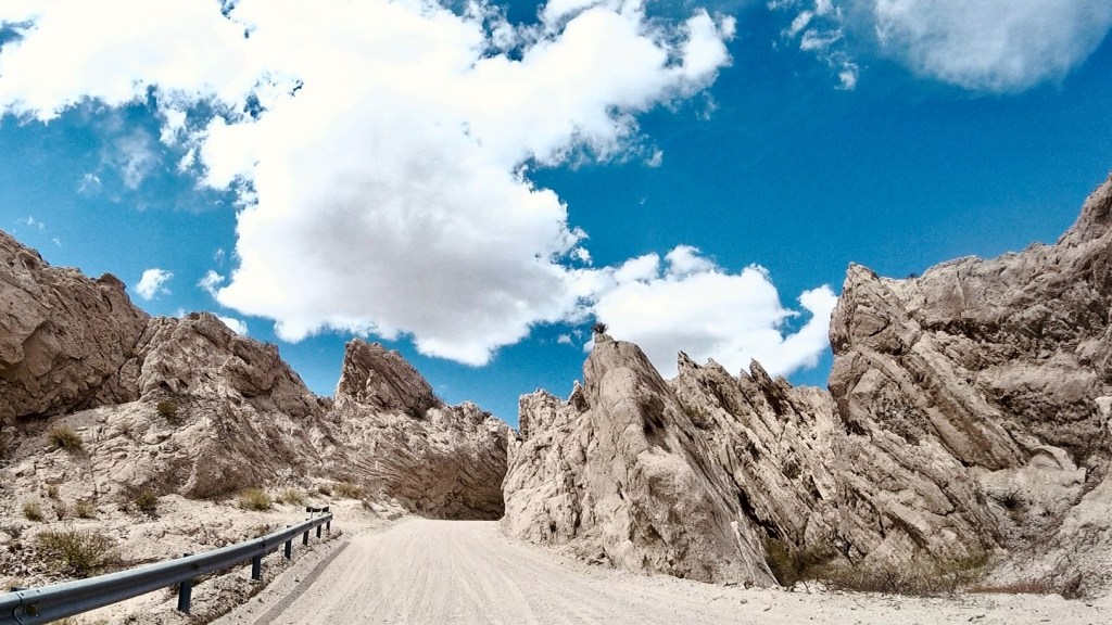 Die sehr gute Bewertung der Unterkunft Sumaq Samai konnte ich nicht überprüfen, ich stand da vergebens 15 Minuten mit klopfen, klingeln und anrufen vor der Türe aber gegenüber gab es mit dem Portal de los Andes ja auch eine anständige Unterkunft. Ich weiss nicht wieso man länger in San Antonio bleiben müsste, darum fuhr ich am nächsten Morgen auch gleich wieder weiter, allerdings ohne konkretes Ziel. Eigentlich wollte ich den höchsten Pass der Anden oder ausserhalb des Himalaya überqueren, den Abra del Acay, da es aber am Vortag geregnet hatte und ich bei der Fahrt Richtung Salta die weissen, frisch beschneiten Gipfel sah, konnte ich mir nicht vorstellen diesen Pass zu überqueren. Ich dachte ich versuche mal die Anfahrt soweit es geht und es ging erstaunlich gut, die Piste war wohl vor kurzer Zeit frisch gegradet (geglättet) worden. Serpentine um Serpentine ging es hoch, ich sah die verschneiten Strassenränder schon von weit unten und trotzdem liess sich das Ganze gut befahren. Da San Antonio schon auf über 3700m liegt, war die Fahrt 45km hinauf auf knapp 5000m, mein GPS zeigte 4984m an, nicht mehr so ein riesen Ding. Die 100 km lange Fahrt dann hinunter ins Tal Richtung Cachi auf 2500m gestaltete sich ein bisschen schwieriger, waren doch einige Furten zu durchqueren und wie gesagt der Regen und die Schneeschmelze brachten doch einiges an Wasser in die sonst wohl trockenen Durchfahrten aber der Anblick der immer wieder faszinierenden Quebradas entschädigt für viele Klippen.
