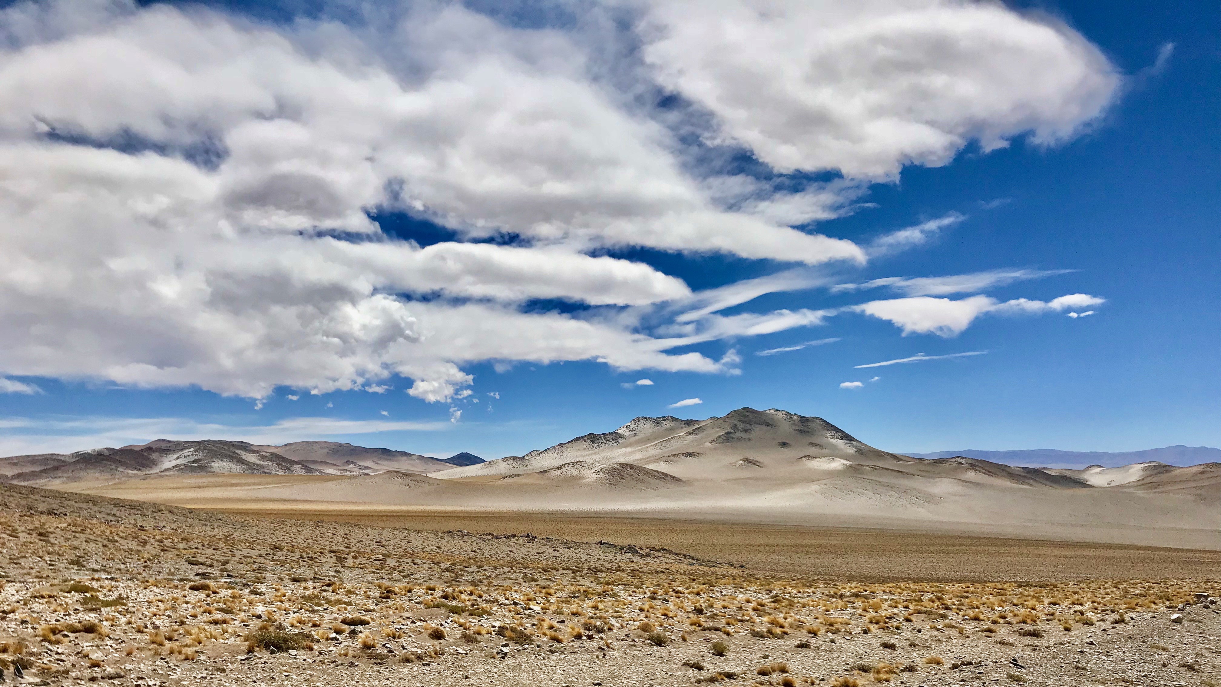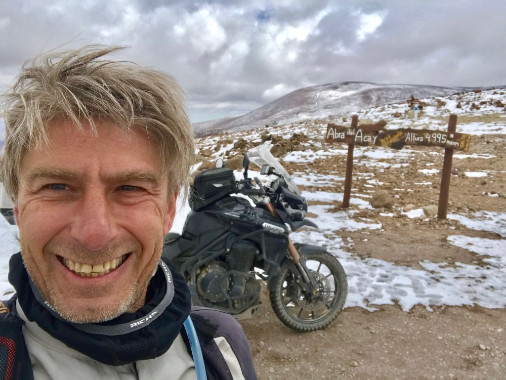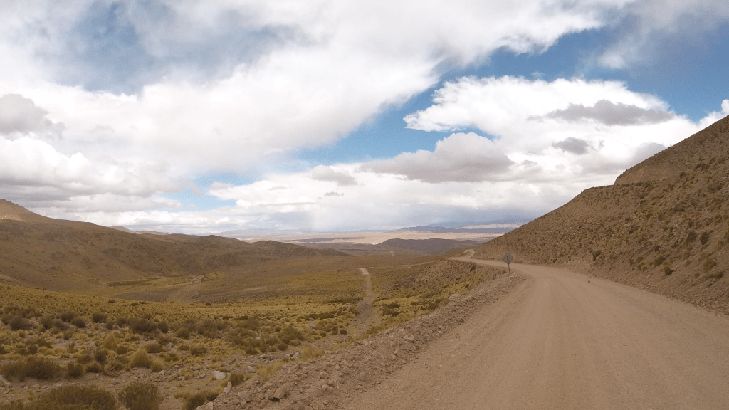 Bis ungefähr 10 km vor der Grenze war die Strasse nun bestens ausgebaut, mit kurzen Umwegen durch die Pampa, weil gewisse Wasserquerungen noch fertiggestellt werden mussten, leider waren diese Umwege meist sehr tief und sandig und somit eher mühsam zu befahren mit meinen 350 kg. An der Grenze stand ich dann 10 Minuten vor einem Schalter, der Beamte spielte lieber an seinem Handy als mich zu beachten, bis ich mich erdreistete zu fragen ob ich hier richtig sei. Eher widerwillig überprüfte er dann mit zwischenzeitlichem Stöhnen und Pausen meine Dokumente aber alles in allem ging auch dieser Grenzübertritt recht zügig von statten. Die nächsten 100 km Schotterpiste waren sehr gut zu befahren, mal mehr, mal zum Glück weniger Ripio. Ripio gibt es komischerweise vor allem in Argentinien ausgeprägt, das sind Querrillen die entstehen wenn Räder beim Beschleunigen durchdrehen oder beim Bremsen blockieren und dieser Ripio kann ganz schön ans Eingemachte gehen, da schüttelt es einem die Plomben aus den Zähnen. Dies war nun meine zweite Einreise nach Argentinien und schon wieder zeigten sich tiefschwarze Wolken über meiner Route und ungefähr 40km vor San Antonio de las Cobres beschlug auch mein Visier zum ersten Mal. Zur selben Zeit fühlte sich auch das Fahrverhalten meiner Triumph plötzlich etwas seltsam an, bis ich merkte dass die Unterlage immer tiefer und ich von Spur zu Spur getrieben wurde. Immer wieder gab es Abschnitte die ich nur im Schritttempo fahren konnte, am Pistenrand häuften sich schlammige Erdrutsche aber glücklichweise war ich zu langsam, das Gewitter schien vor mir zu flüchten, trotzdem brauchte ich für diese letzten 40km ungefähr 2 Stunden.
