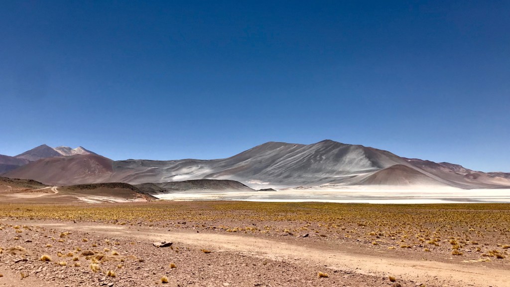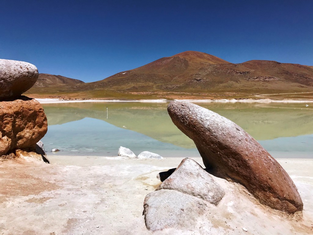 Auf all den Plakaten vor den Büros der Tourenanbieter in San Pedro sprang mir immer wieder ein Bild der Piedras Rojas ins Auge, seltsam rund geformte, rote Steine vor einem weiss strahlenden Salar, also Salzsee. Voller Erwartungen war ich dann, als ich merkte, dass meine Route über den Paso Sico daran vorbeiführen sollte. Nun ging es zunächst einmal beinahe 80 km dem Salar de Atacama entlang, rechts eine unglaubliche Weite in der sich der Horizont im Flirren der Hitze verlor und links wie an einer Perlenkette aufgereiht diverseste Vulkane. Plötzlich begann sich die Strasse einen dieser Vulkankegel hochzuschrauben, an Socaire vorbei, immer noch asphaltiert bis dann ein Schild folgte, 80 km Baustelle…. Glücklicherweise war diese schon sehr weit fortgeschritten, so dass es sich beinahe bis zu den Piedras Rojas, nach 150 km ab San Pedro, wunderbar auf neuestem Asphalt fahren liess. Die Lagune oder der Salar waren sehr einfach zu finden, einfach den dutzenden Tourbussen folgen die sich an dessen Rand aufgereiht hatten, für mich sah das aus wie im Herbst oder Winter wenn in Zürich der Nebel tief sitzt, an den Trams die Schilder Üetliberg hell montiert waren und ganz Zürich sich auf dem Üetliberg an der Sonne einreihte. Es war praktisch unmöglich Fotos dieser eindrücklichen Landschaft zu machen ohne selfieposierendes Selbstdarstellertum im Bild zu haben.