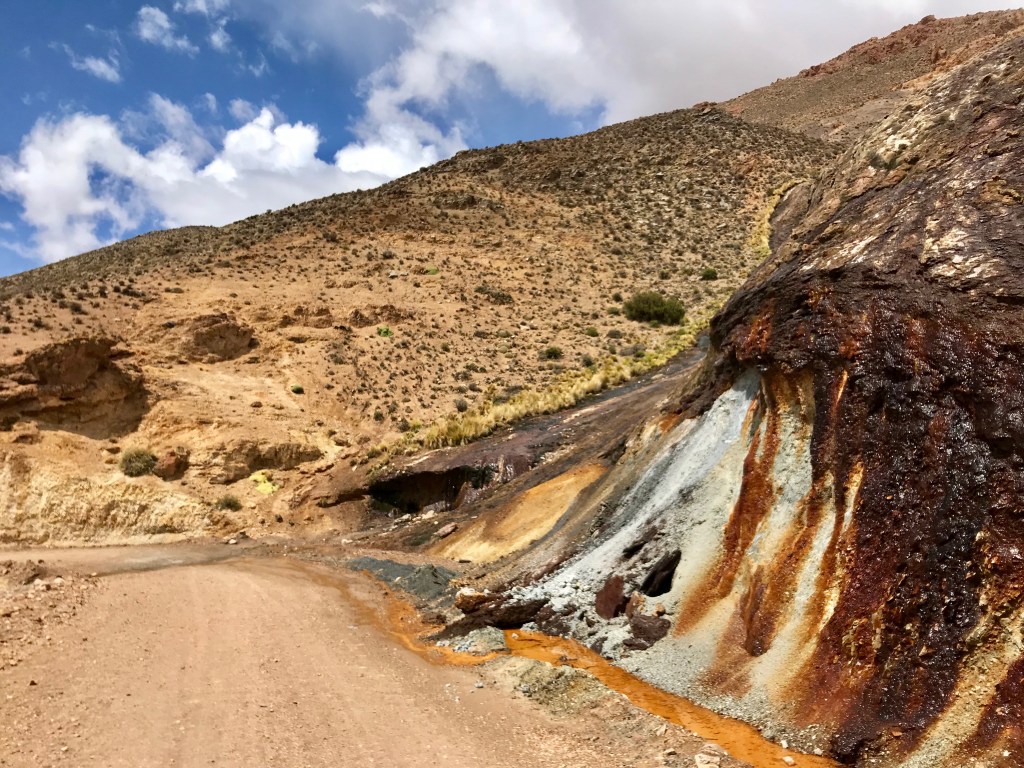 Der nächste Tag und die Fahrt über den Paso San Francisco lässt sich zweiteilen, der erste, argentinische mit der Anfahrt zum Pass ist eine bestens ausgebaute Passstrasse durch eine fantastische Landschaft mit Quebradas und gesäumt von knapp 6000m hohen Vulkanen, der zweite in Chile dann teilweise miesester Ripio mit bis zu Kindskopf grossen, scharfkantigen Brocken. Nach 180 ortsfreien und bis auf ein Auto und 3 Motorräder verkehrsfreien Kilometern, von wegen öfter befahren, wurde ich sehr freundlich am argentinischen Zoll empfangen, dieser liegt noch 20 steile Kilometer vor der eigentlichen Passhöhe auf über 4700m die dann die Grenze zu Chile markiert und gleich in die angesprochene schlechte Piste überleitet. Bei der Laguna Verde nach ungefähr 20 km verbessert sich dann die Piste und nach weiteren 20 km zeigen die chilenischen Bemühungen zur Verbesserung der Infrastruktur Wirkung, denn es geht nun bis zum chilenischen Zoll weitere 80 km auf bestem Asphalt weiter, es liegen also 120 km zwischen den beiden Zöllen, da ist es besser wenn die Papiere in Ordnung sind. Der überaus nette Empfang einer Zolldame und ihre Begleitung durch sämtliche Stellen sollte mich eigentlich skeptisch stimmen, war sie doch die erste die mich an einem der dutzend Landesübertritte filzte, oder nahm es sie einfach Wunder was so ein Weltreisender alles so im Gepäck hat? Ihr süffisantes Lächeln bei meiner Weiterfahrt linderte jedoch keinen der Schläge die auf den nächsten 30 km folgen sollten, allerdings war es danach auch nicht so schlimm wie sie vorhergesagt hatte, es ging 120 km auf geschliffener Salzpiste durch ein ödes Tal vorbei an Minen mit giftigem Abfluss hinunter nach Copiapo. Alles in allem ein Ritt über 470 km und mehr als 3000 Höhenmeter, gut hatte ich als Vorsorge nochmal 2 grosse PET-Flaschen mit Sprit dabei, es wär wohl um den berühmten Kilometer nicht aufgegangen mit dem Benzinvorrat.