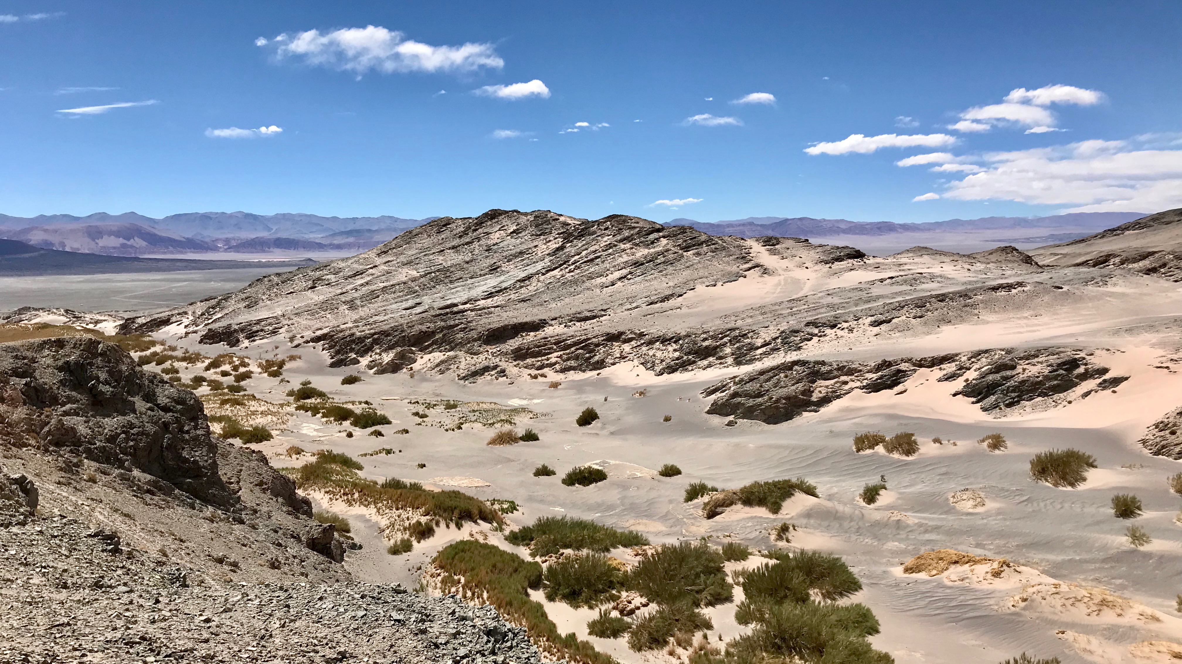 Von verschiedener Seite empfohlen war das nächste Ziel Antofagasta de la Sierra und da würde schon die Anfahrt zur Herausforderung, so hörte ich zumindest, dass der Ort nur mit 4×4 oder Bus in ca. 6 Stunden Fahrt zu erreichen sei. Die gut 200 km auf der auf diesem Abschnitt fast ausschliesslich bestens ausgebauten Ruta 40 bis nach Hualfin waren schnell vorbei, sind doch die Badenes (Senken statt Brücken bei Flüssen und Bächen) die einzigen Bremser, ansonsten geht es meistens und mehrfach mehr als 20 km geradeaus. Nach dem Abzweiger mit der letzten Tankstelle ging es 25 km asphaltiert bis Villa Vil, dann folgten 30 km gut zu befahrenden Ripio mit einer Flussdurchquerung, die bei Wasser wirklich schwierig sein könnte und erstaunlicherweise folgten dann 100 km bis zum nächsten Ort El Peñon bestens asphaltiert. Allerdings musste doch einiges an Höhe bewältigt werden, meiner Triumph ging jedenfalls der Schnauf aus und der Puls hoch bis zum Kochen bis sie sich mehrfach über die 4500m gekämpft hatte. Die Natur scheint so sanft, Flächen und Hänge voller feinstem Sand, abgelöst oder durchzogen von weichen Formen und Farben der Grasbüschel die sich über weite Strecken der Landschaft ziehen und von Millionen von Vicuñas, so scheint es, bewohnt und begrast werden, allerdings sind diese so gut getarnt, dass sie nur durch Bewegung oder im letzten Moment bemerkt werden. Leider aufge- und verscheucht durch einen entgegenkommenden LKW, ja dem einzigen auf der ganzen Strecke, habe ich ein paar Nandus gesehen, quasi das südamerikanische Pendant zum Strauss. Es war sehr lustig zu sehen wie sie davonrannten, immer wieder aus dem Gleichgewicht gebracht durch die heftigen Windböen und wie sie versuchten mit den Flügeln die Balance zu halten. Nach El Peñon ging es hinunter auf eine riesige Fläche die als Baustelle/Schotterpiste am besten mit hohem Tempo zu durchfahren war, nur so waren die tiefen Spuren nicht allzu lästig und zuletzt ging es dann wieder auf Asphalt am Auswurf der beiden Vulkane vor Antofagsta vorbei, auf der einen Strassenseite Sand und Fels, auf der anderen grosse schwarze Lavabrocken, ein eindrücklicher Anblick.