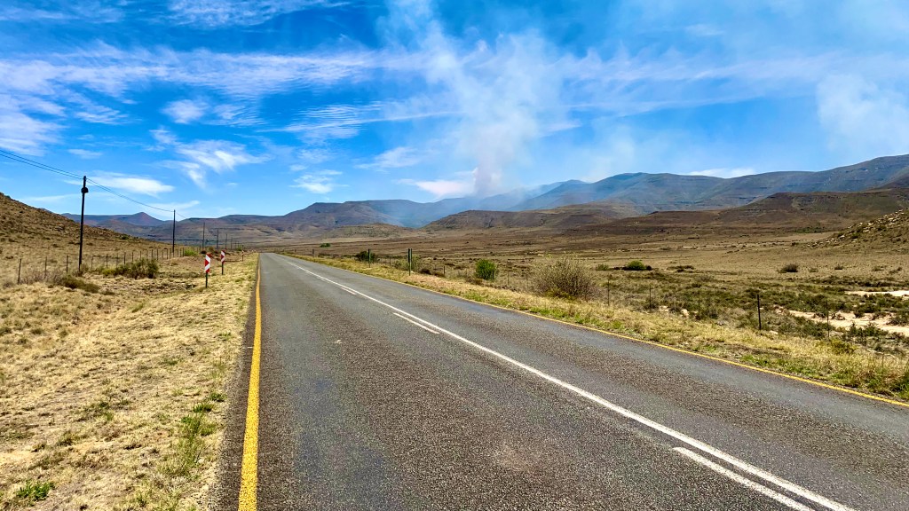 Erst der Frühsport und dann die grosse Langeweile. Kaum hatte ich New Bethesda verlassen, ginge recht grob über einen kleinen Pass und ungefähr eine Stunde quasi über Stock und Stein, wobei Stock eher mit Kies und Sand ersetzt werden müsste. In weiter Ferne sah ich schon früh dicken Rauch aufsteigen und bei all meinem Glück hatte ich damit gerechnet genau durch dieses Gebiet zu fahren aber knapp daneben ist auch vorbei, was ich bei den Millionen kleiner Heuschrecken die die Strasse kreuzten nicht sagen kann, da gab’s echt kein Ausweichen, sorry!