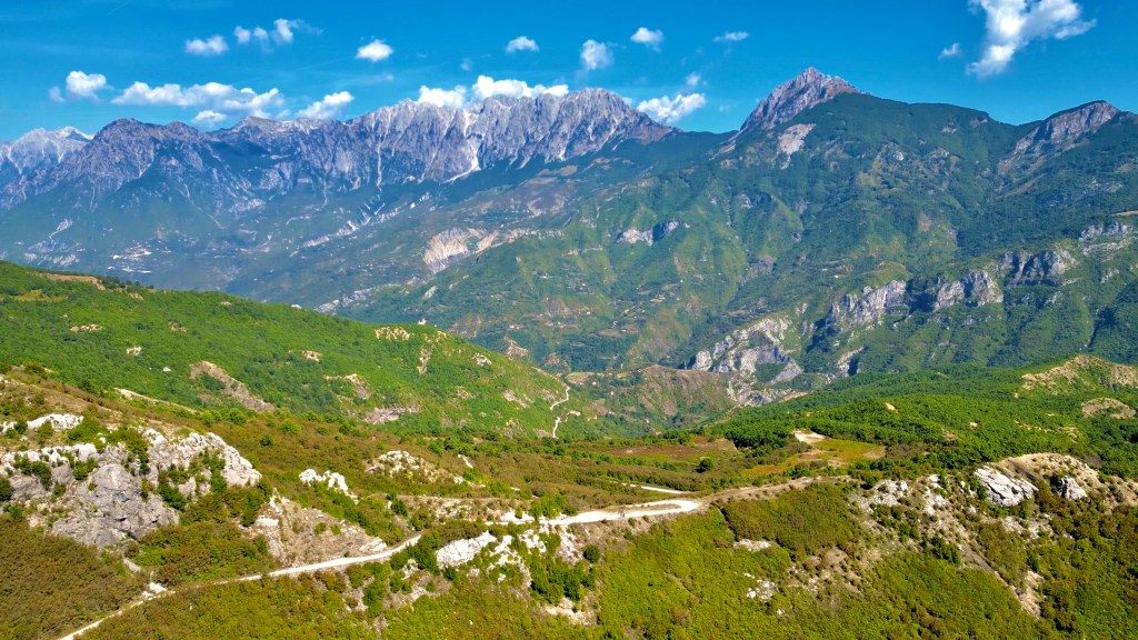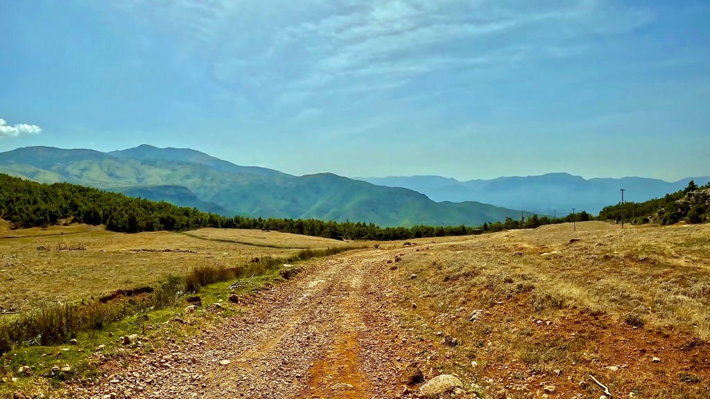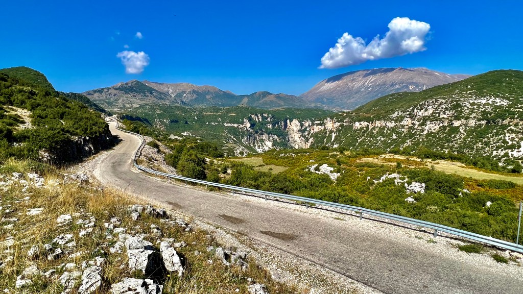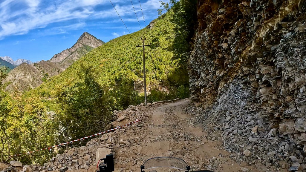 In den einschlägigen Foren und Facebook-Seiten wurde aber schon seit Tagen gewarnt vor der Passage eines Felssturzes auf der TET-Route durch den Lurë Nationalpark, so folgte ich zwar dem TET auf knapp 8 km, dieser führte hier teilweise über eine Hoxha-Autobahn aber dann zog ich es vor die direkte Route Richtung Burrell zu nehmen. Diese Route über die SH36 war bestimmt ähnlich schön aber sicher viel kürzer und führte nach ein paar Serpentinen entlang einer steilen Bergflanke hoch zu einem Pass, dort zweigt der TET rechts ab.