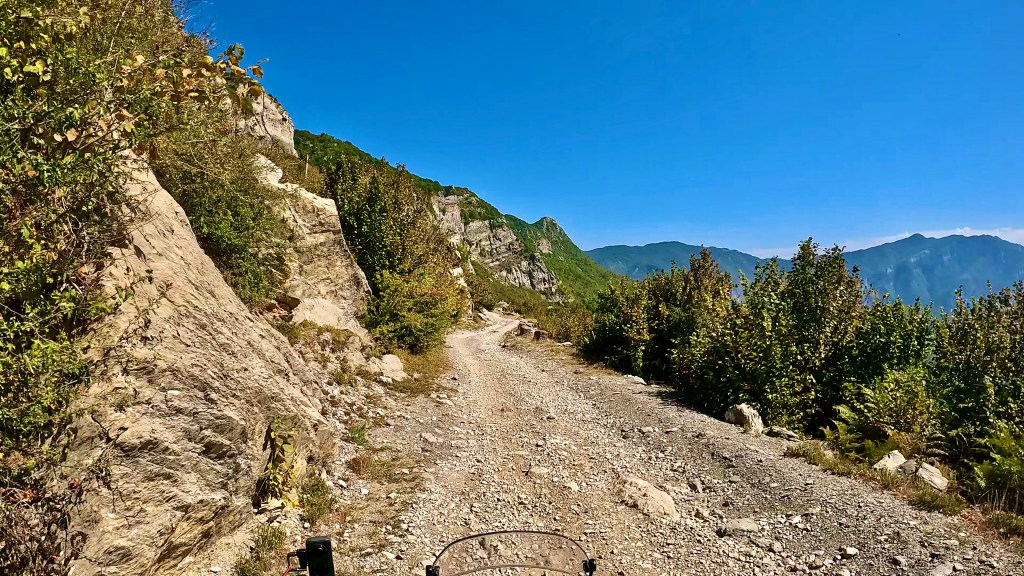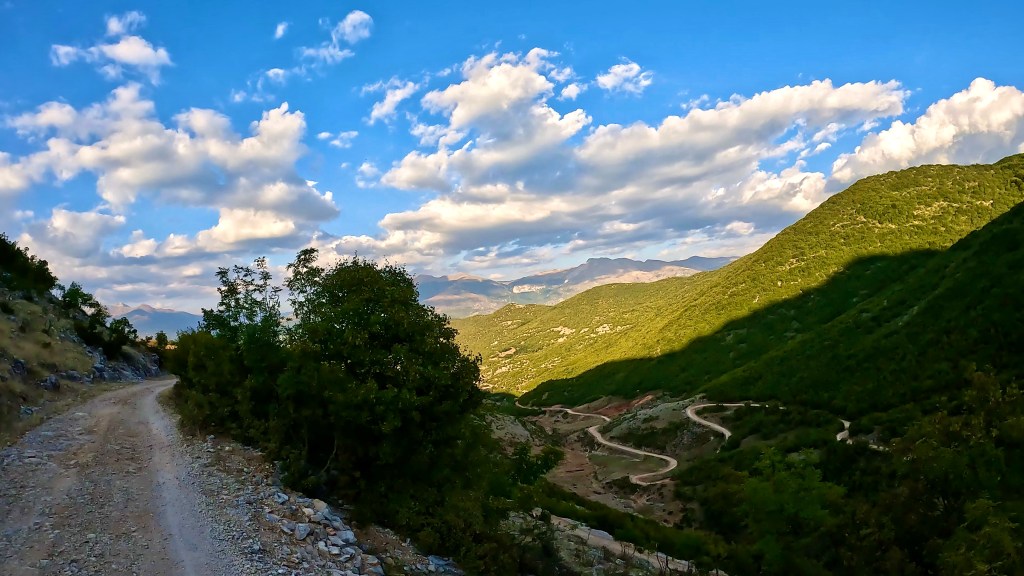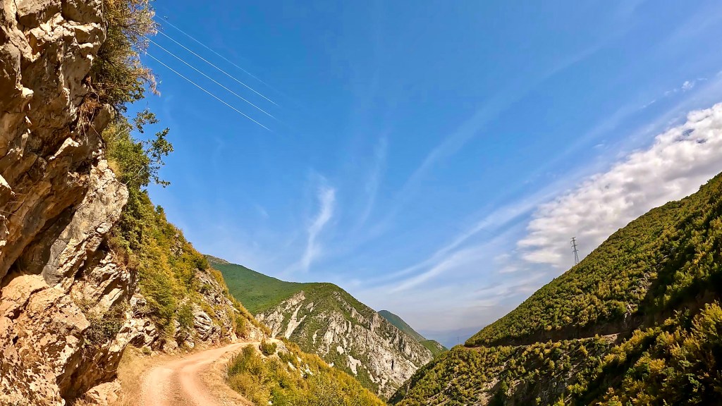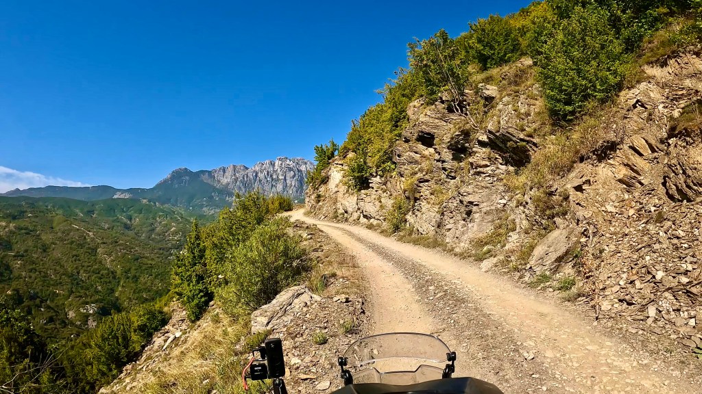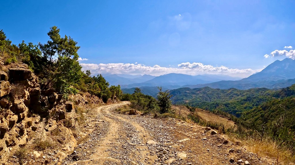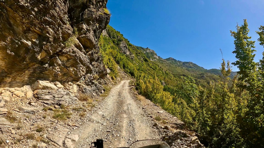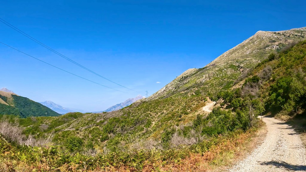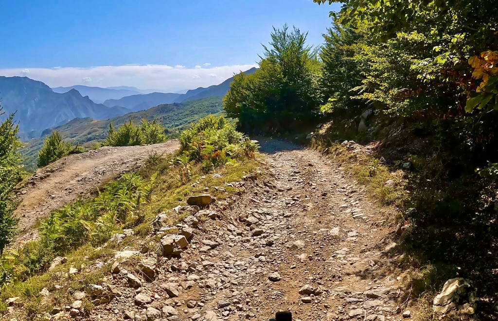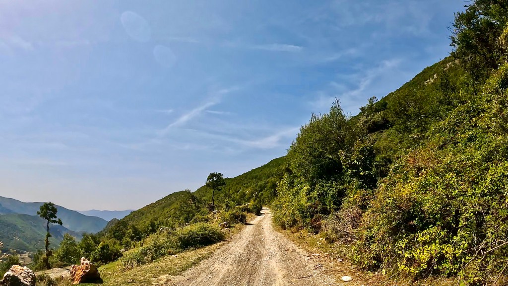 Zurück auf dem TET geht es in vielen Kehren recht steil hoch (ok, da war auch eine direkte Linie mit etwa 30% Steigung zwischen 2 Kehren mit dabei / der TET Track lässt grüssen) und oben auf einer Art «Kammstrasse» weiter bis Zavalinë, dort führt die Route erst durch einen Wald und später immer einer steilen, felsigen Flanke entlang bis Gjinar.