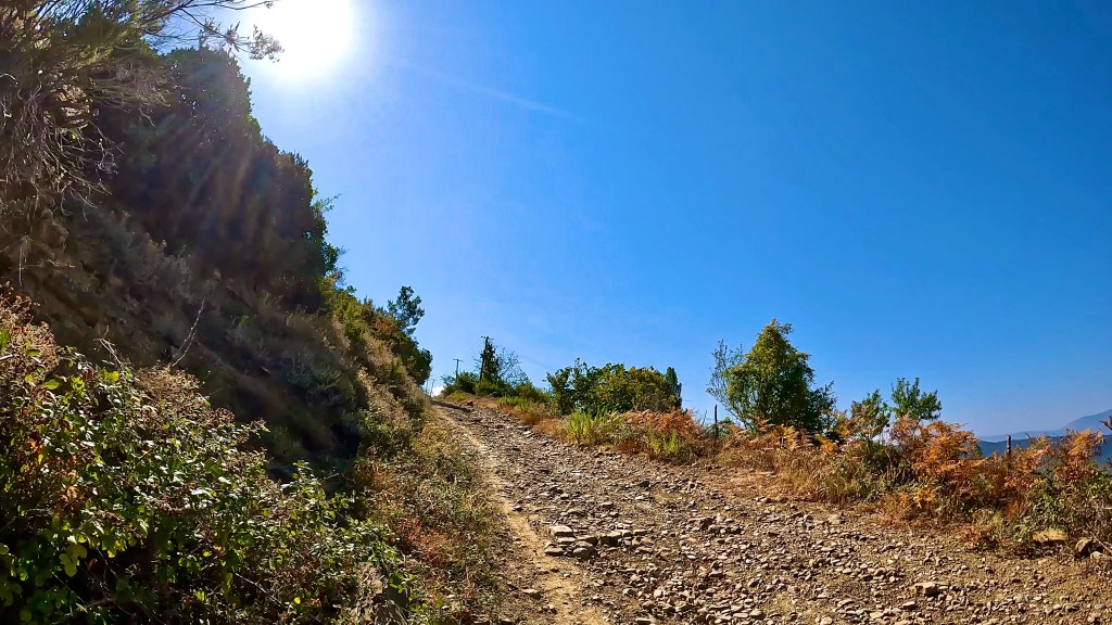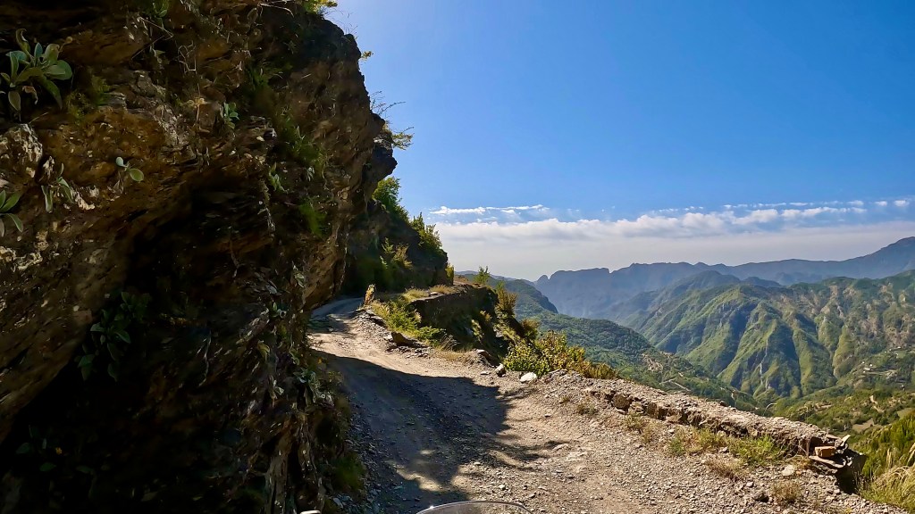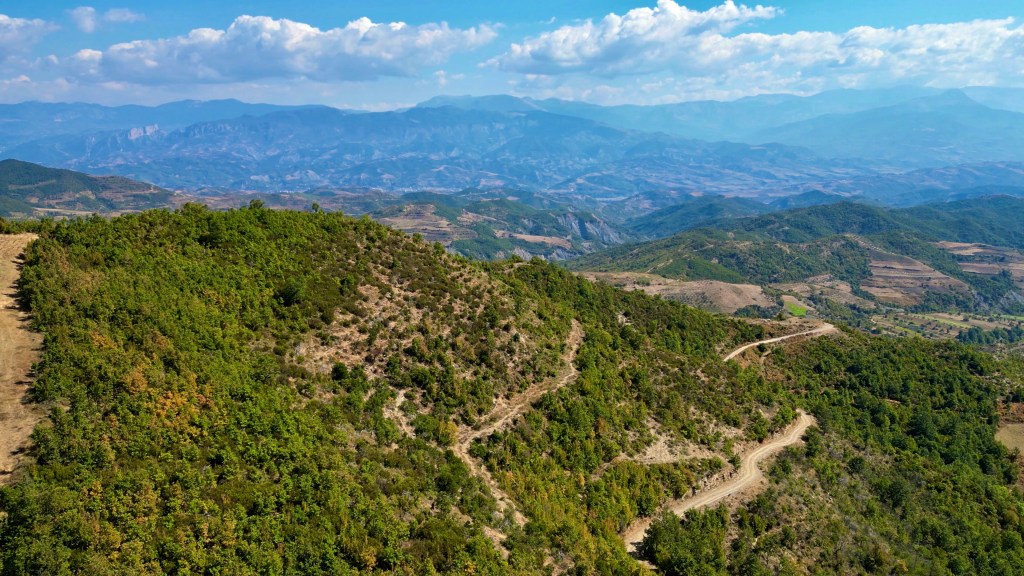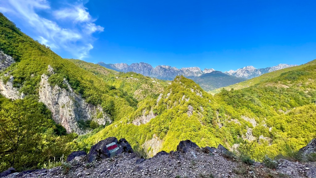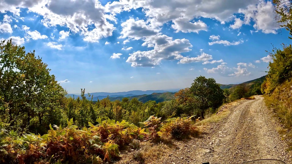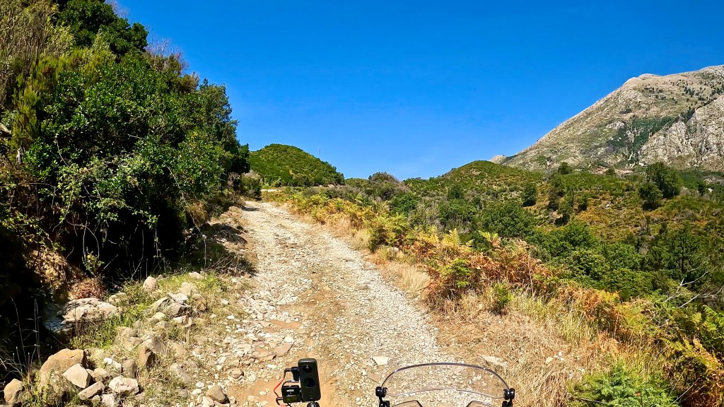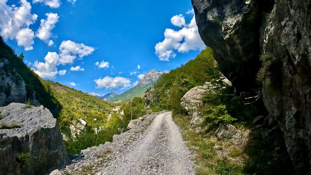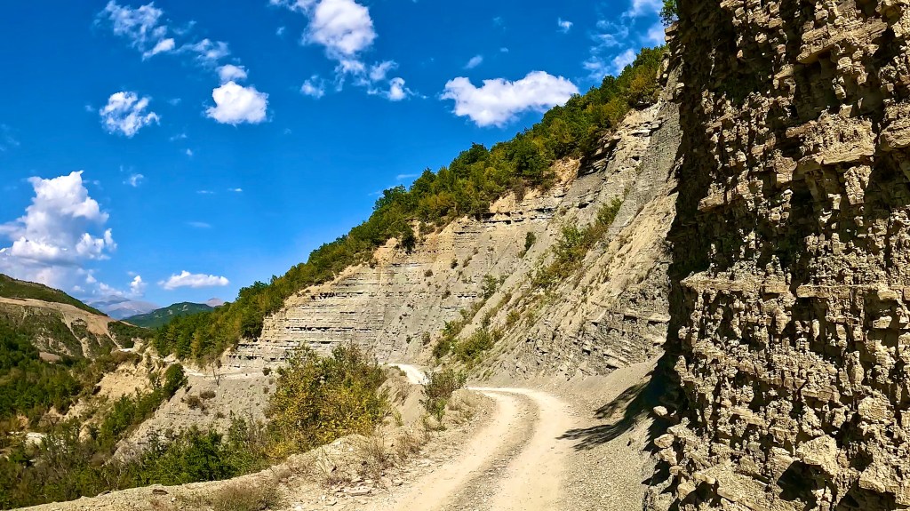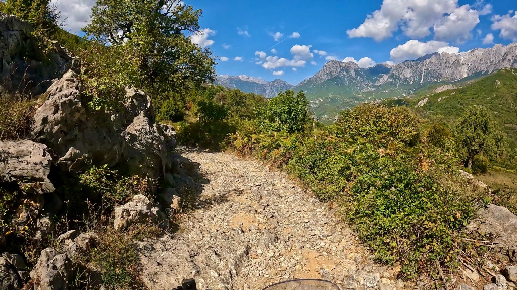 Zurück auf dem TET geht es in vielen Kehren recht steil hoch (ok, da war auch eine direkte Linie mit etwa 30% Steigung zwischen 2 Kehren mit dabei / der TET Track lässt grüssen) und oben auf einer Art «Kammstrasse» weiter bis Zavalinë, dort führt die Route erst durch einen Wald und später immer einer steilen, felsigen Flanke entlang bis Gjinar.