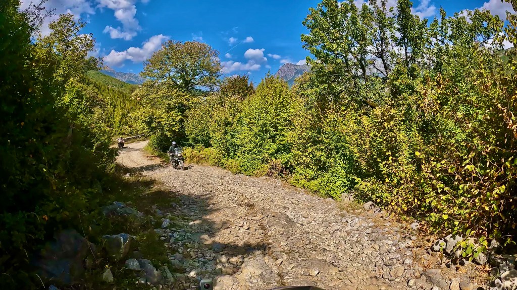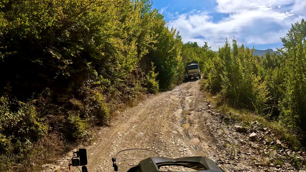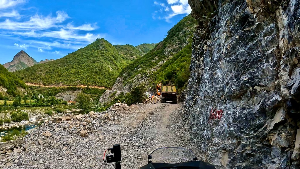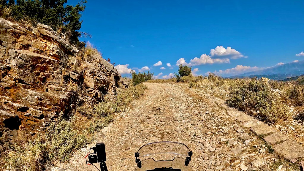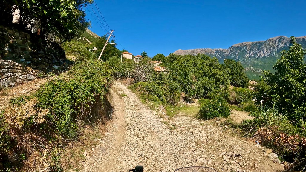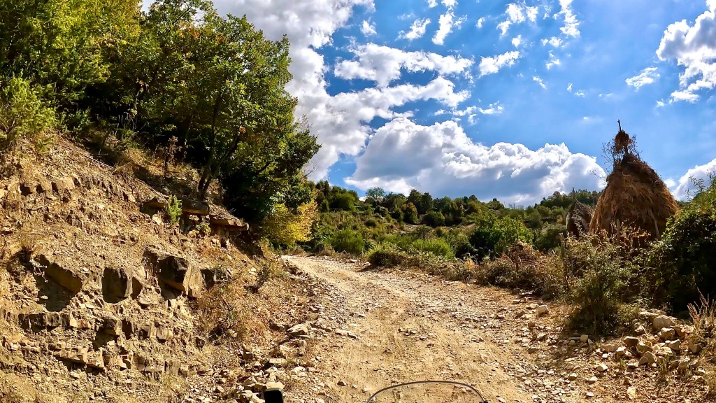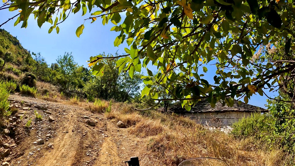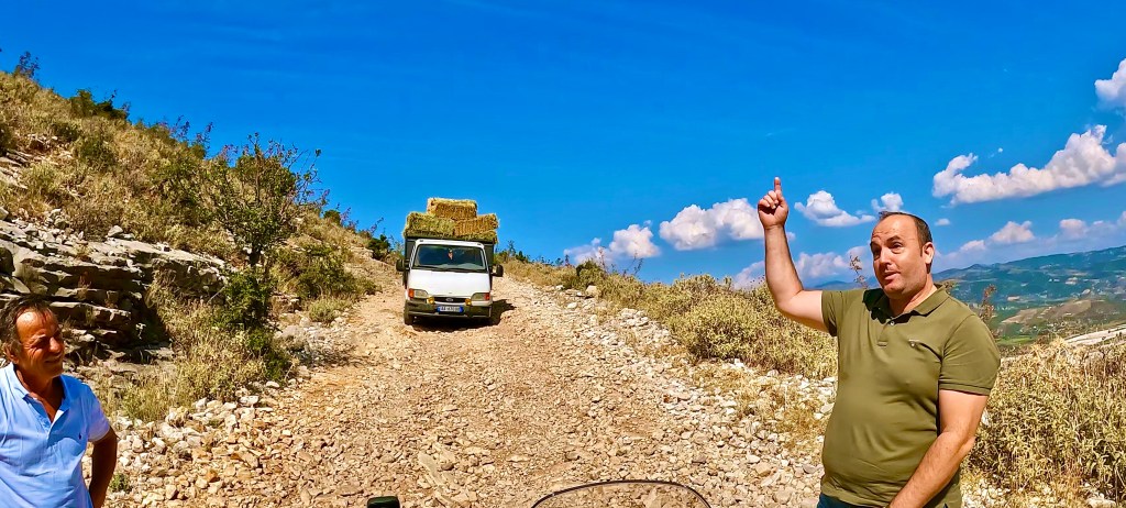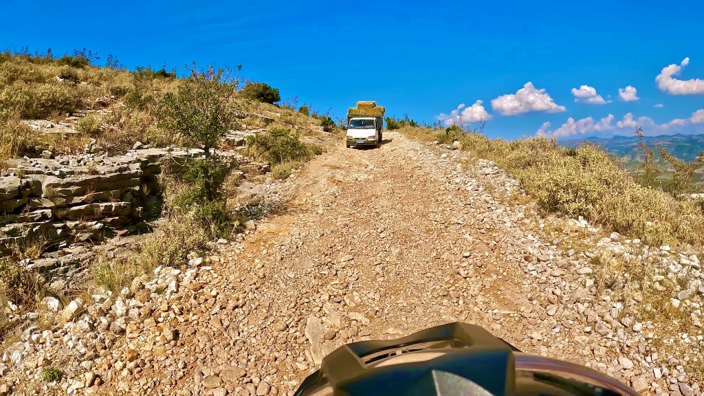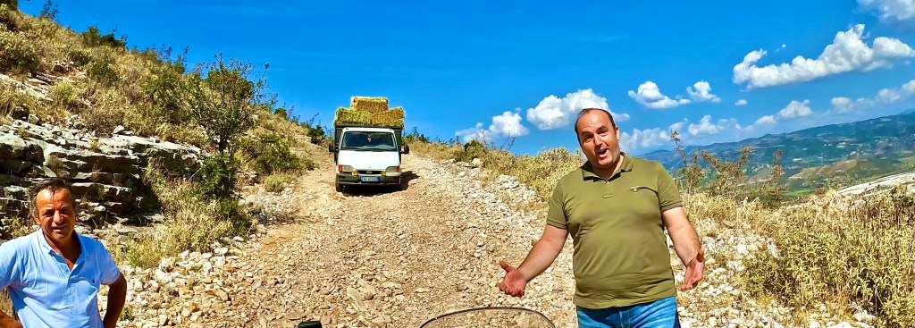 Von dort ging es nun wieder unbefestigt weiter, bis zum nächsten Dorf noch sehr einfach aber dann folgte eine wie sie von mir genannt wird «Hoxha Autobahn», also eine sehr grobschottrige Angelegenheit mit alten Pflastersteinen durchsetzt, solange das nicht zu steil ist war ging das noch aber plötzlich war da eine Gerade den Berg hoch, wie ein Flussbett mit 10-15% Gefälle. Irgendwann fehlte mir im tiefen Schotter die Traktion und ohne viel Momentum dann auch das Gleichgewicht so dass ich anhalten musste. Während ich noch überlegte wie ich da rauskomme kam ein kleiner Transporter mit Strohballen beladen den Berg runter und da ich mitten in der Strasse stand, mussten mir die netten Herren, zuerst widerwillig, helfen das Motorrad zu drehen nachdem sie mir bedeutet hatten, dass es die nächsten 15 km genauso aussehen würde.