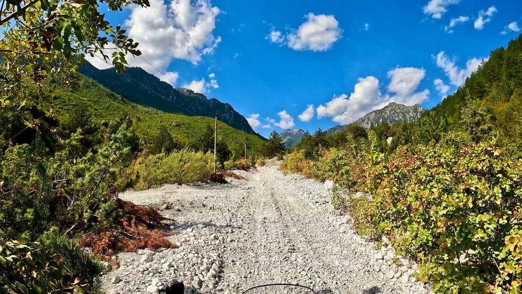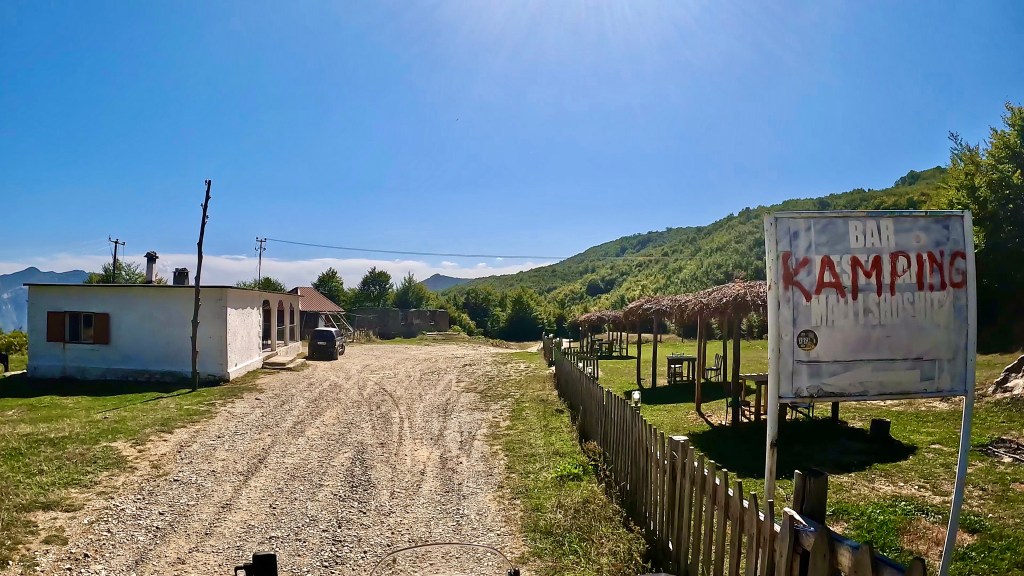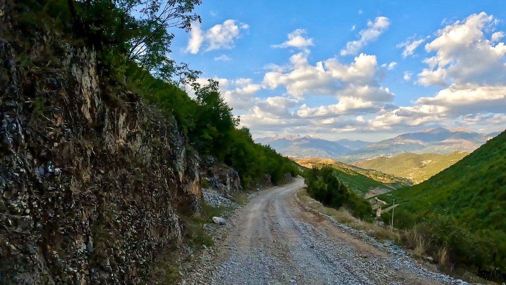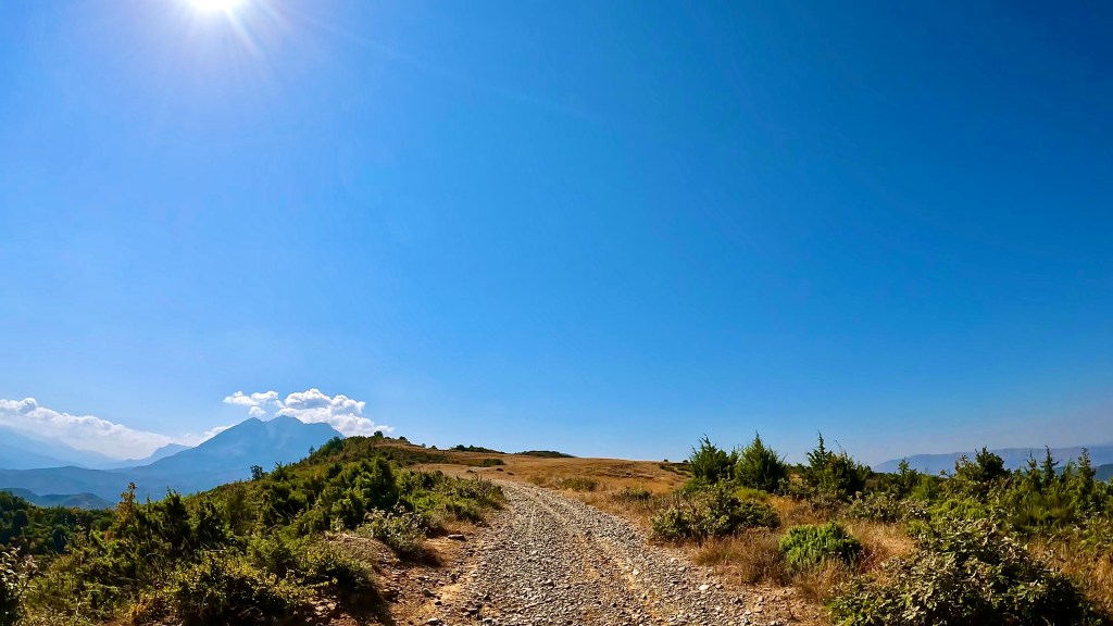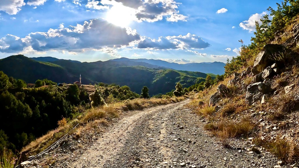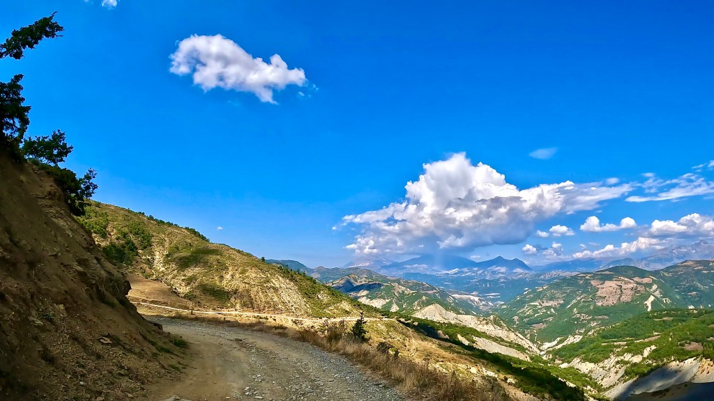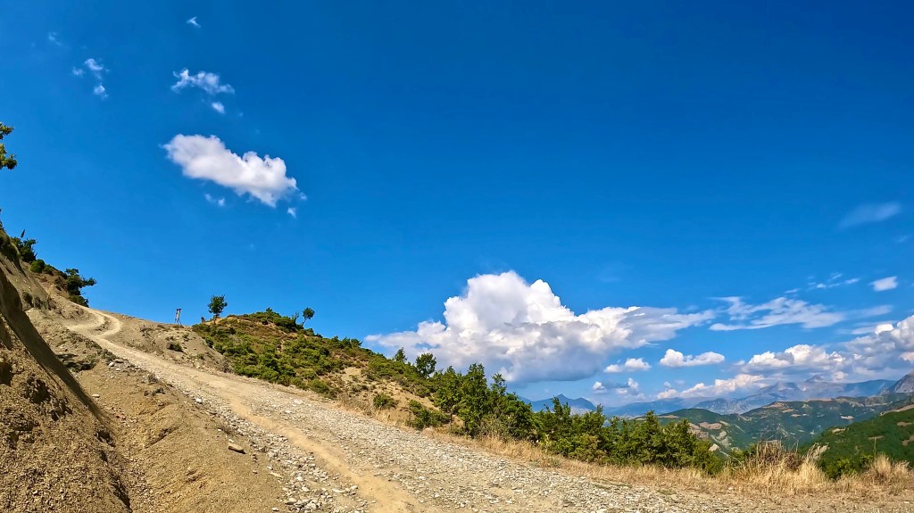 Auch wenn die dunklen Wolken am frühen Morgen nichts Gutes verhiessen und in der Nacht auch Regen brachten, wurde es doch wieder ein wunderbarer und schliesslich auch viel zu heisser Tag in den albanischen Bergen. Die letzten 70 km ausnahmsweise sogar super kurvig auf Asphalt.