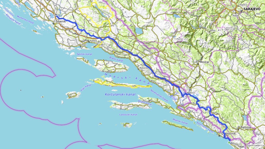 Alles Asphalt, trotzdem sehr spezielle und zügige Route praktisch ohne Verkehr, so ging es also von Aussicht auf Dubrovnik 300 km nördlich zum Eingang der Krka-Wasserfälle.