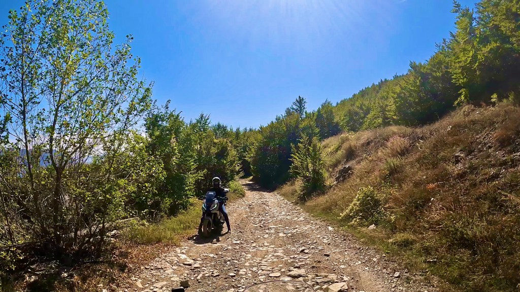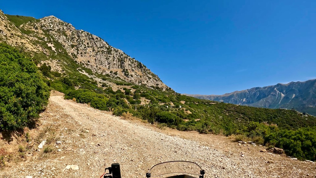 Vor 5 Jahren hatte ich die Strecke von Gramsh nach Berat schon mit der Triumph Tiger in Angriff genommen, musste aber kurz vor der Passhöhe kapitulieren, dieses Mal sollte dies doch mit der leichteren Aprilia machbar sein, zumal das schwere Stück diesmal hinunter befahren werden konnte, so dachte ich zumindest. Zuerst ging es beschwingt auf einer eher sandigen Piste in ein Tal hinein, nach der ersten richtig steilen Kehre bemerkte ich dass ich wohl falsch fuhr, denn der Track führte geradeaus, kurz runter und durch einen kleinen Fluss um auf der anderen Seite dann so richtig steil anzusteigen. Das war ein unglaublich harter Aufstieg, mehrmals überlegte ich mir eine Umkehr aber schreckte immer wieder zurück weil ich die überstandenen Passagen nicht noch einmal fahren wollte. Da waren tiefe Auswaschungen und kurz vor einer Kehre blieb ich gar mit der Kamera auf dem Helm in einem Ast hängen, das hätte echt nicht blöder kommen können, trotzdem überwand ich auch diese Hürde um mir dann gleich bei der nächsten Kehre wieder die Sinnfrage zu stellen.