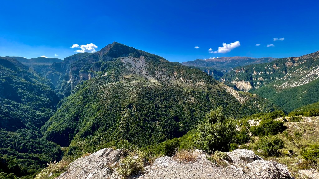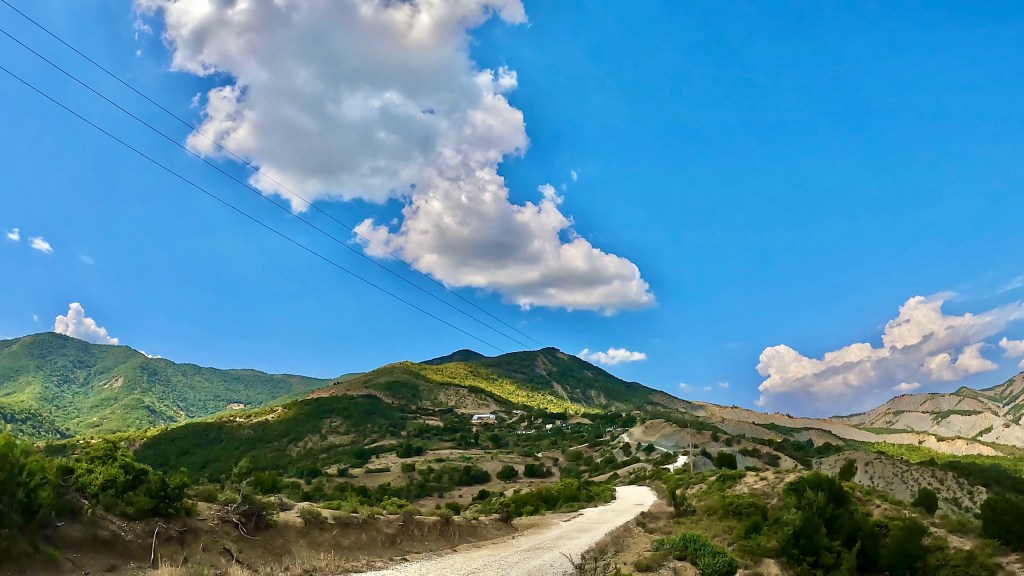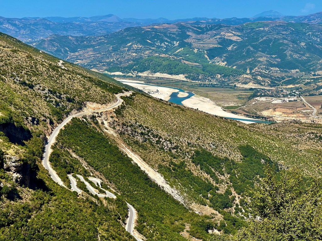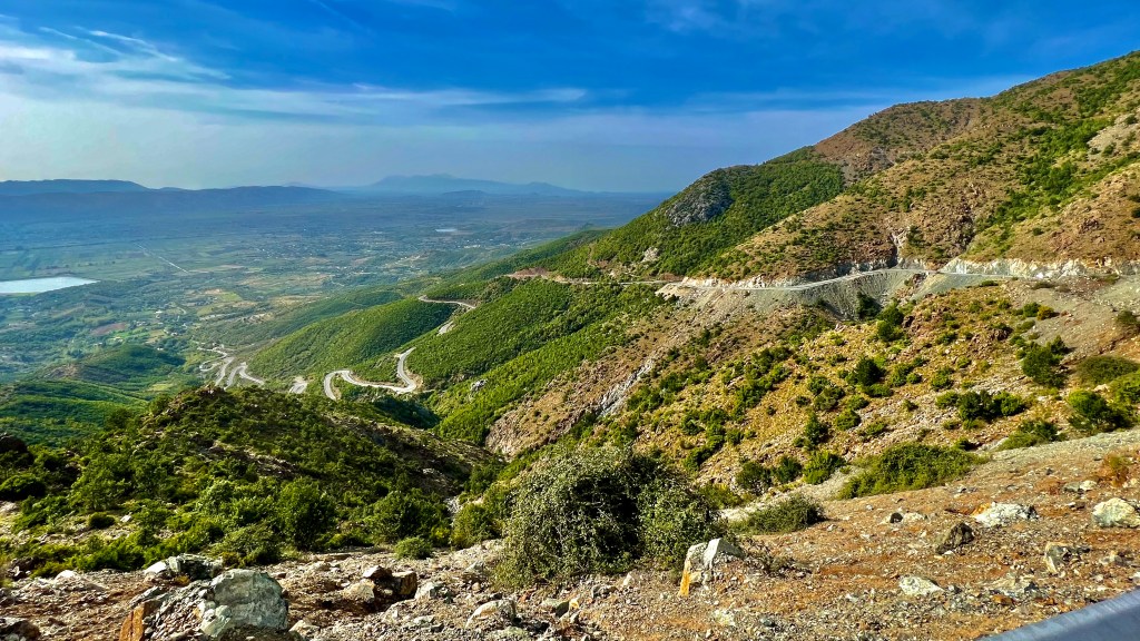 Die meist einfache Abfahrt hinunter ins Tal bot immer wieder neue Panoramen, allerdings stiegen die Temperaturen gefühlt mit jedem Meter, da war ich in Rrëshen froh ein schattiges Plätzchen vor einem Lebensmittelladen zu finden und Kraft zu tanken.