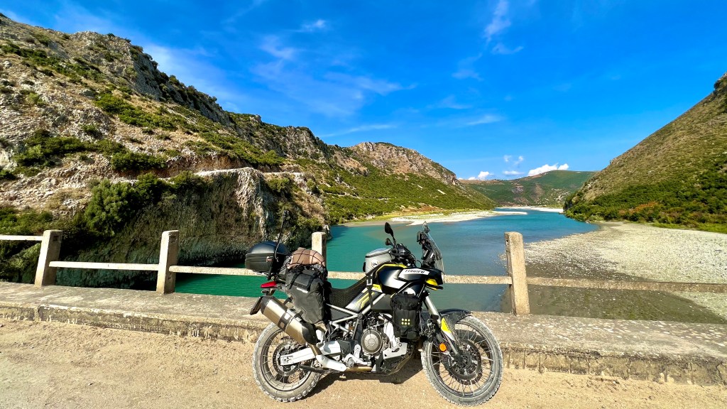 Die unbefestigte Hauptstrasse SH100 nach der einzigen Brücke über die Vjosa weit und breit hatte ich Jahre zuvor schon mit der Triumph Tiger gefahren, diesmal wurde aber gebaut, was da und dort recht schwierig war aber eher in Erinnerung bleiben wird wieder der Gestank aus den rostigen Ölbohrtürmen die in der Gegend rumstehen.