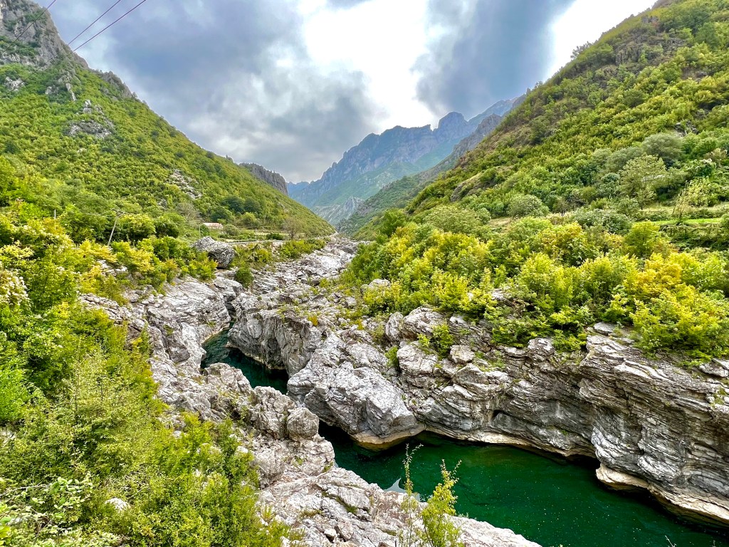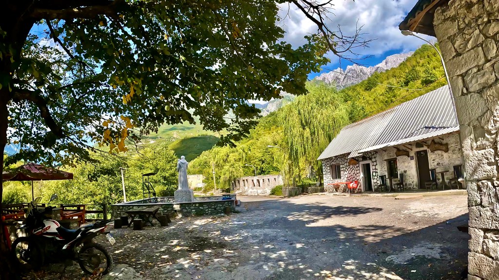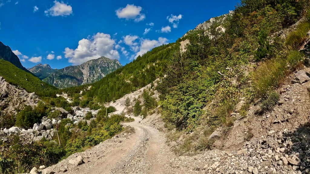Tja und dann denkst du beim Überqueren des Flusses du hättest es geschafft aber weit gefehlt, da geht es nochmal 2 km durch einen Canyon und stehst auf Asphalt vor einem Restaurant und einer Ruine aber danach geht’s nochmal weitere 8 km teilweise auf sehr tiefem Schotter, durch Pfützen, Sand und Wasserdurchfahrten bis zu einem neuen Hotel an einer Brücke und nun, seit neuestem asphaltierten Strasse weiter nach Theth.