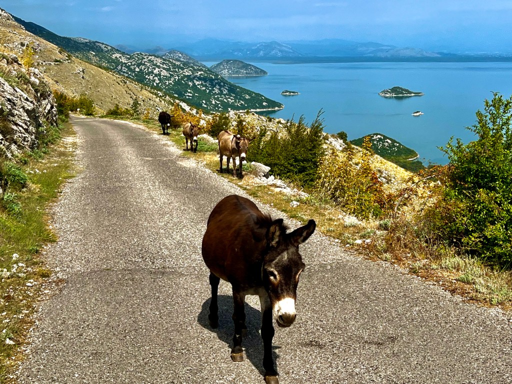 Kaum über die Grenze rüber bog ich rechts ab auf ein kleines Strässchen Richtung Berge, richtig schön und kurz vor dem Abbiegen auf die Hauptsstrasse auch super steil. Diese «Hauptstrasse» führt dann atemberaubend an der Bergflanke entlang, die den Shkodrësee quasi vom Meer trennt, auch diese Strasse hatte ich schon beim 1. Besuch dieser Gegend befahren, gehört einfach zu den Highlights dort, egal ob der alten Kastanienbäume, der Eselparade, der Aussicht auf See und Berge oder am Ende dem hübschen Virpazar wegen.