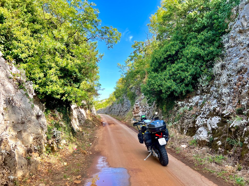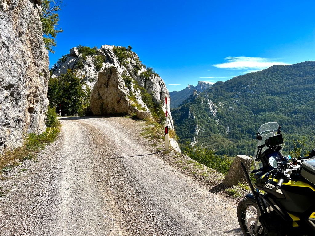 Raus aus dem «Fjord» bei Skradin auf einer hübschen, kurvigen Strasse und dann geht es lange über lange Gerade bis kurz vor Medvida, diese kurvige Strasse hinunter nach Obrovac fahre ich immer wieder gerne und schon ist man in Winnetou’s Land, in diesem Canyon wurden einige Szenen für verschiedene Filme gedreht. Kaum die Hauptsstrasse D54 überquert, führt eine sehr kurvige, hübsche Strasse hoch zum Autobahntunnel und ab dort unbefestigt und einfach atemberaubend schön hoch zum Mali Alan, diese Route ist Teil des ACT. Wohl wegen Starkregen war die Schotterpiste teilweise sehr tief und nicht ganz einfach zu fahren.