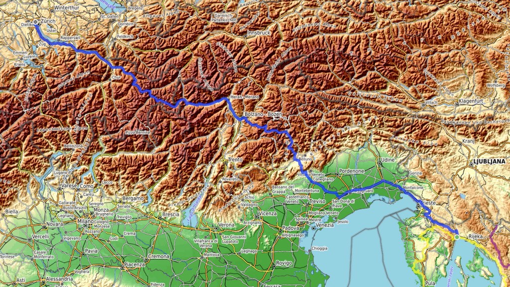 Ab nach Hause, zuerst auf kleiner Strasse quer und schnell durch Istrien, dann auf der Autobahn schnellsten nach Conegliano und schliesslich über Passo San Boldo, vorbei am Lago del Mis, der Forcella di Franche, Passo San Pellegrino, Passo di Costalunga, Bozen, den Ofen-, Flüela und Wolfgangpass nach Landquart, huch, ja das geht eben auch mit der Aprilia im Gegensatz zu leichteren Motorrädern, die wohl Offroad einfacher zu fahren wären…..