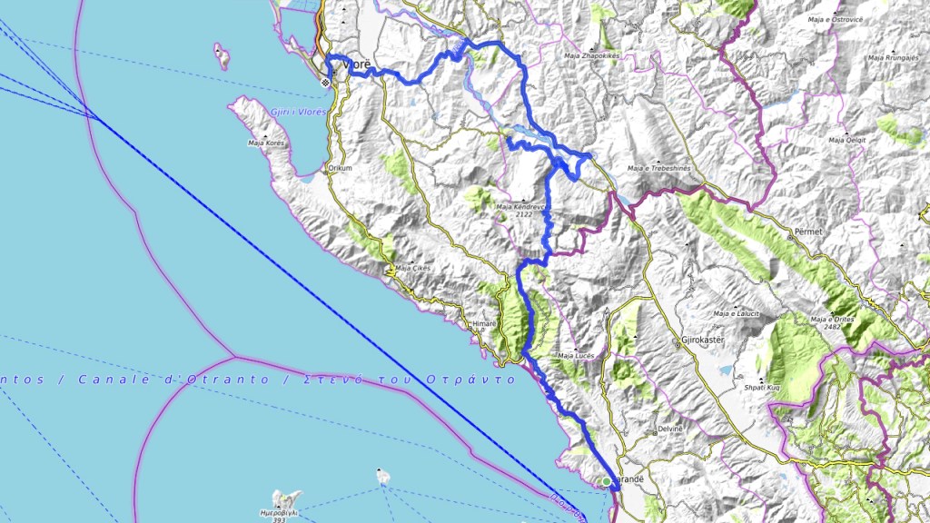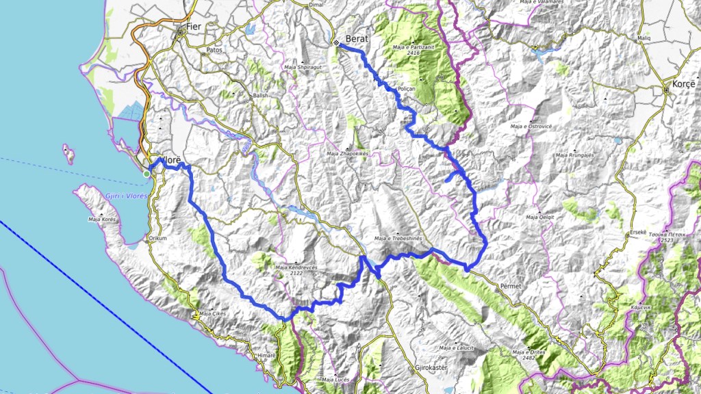 Von Vlorë ging es heute zuerst direkt nach Kuç, von dieser Strecke hatte ich mir viel mehr erwartet und dann auf dem TET wieder kurz das gleiche Stück wie gestern über den schönen Pass Richtung Tepelenë, wobei ich hier beim Restaurant dann rechts abbog und ab Progonat die vielen Ausblicke in den tiefen Canyon genoss. Nach der Schlucht von Këlcyra gings immer noch auf dem TET weiter und ab Piskovë endlich unbefestigt in ein Tal rein, um nach etwa 5 km links weg auf einer stark geschotterten Piste die Berge zu erklimmen. Teilweise extrem steile Rampen hoch bis Raban und dann im stetigen auf und ab über die Berge bis es bei Sevran i Madh definitiv steil hinunter in den Canyon geht, vorbei einem einem netten Picknickplatz an einem kleinen Stausee.