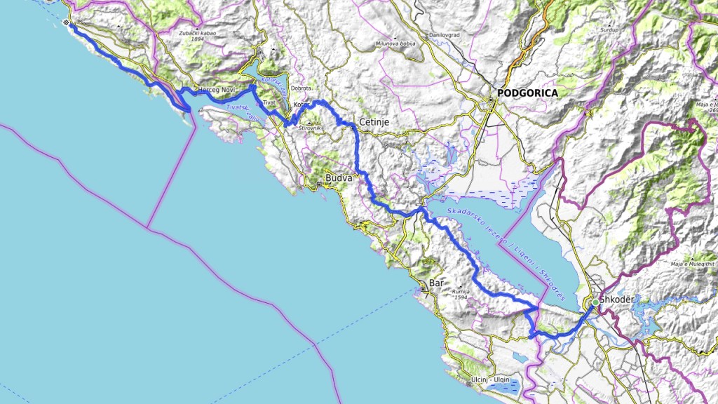 Alles Asphaltiert, trotzdem teils sehr schöne kleine Strassen, so von der Grenze bis Virpazar, natürlich der Pass hinunter nach Kotor und dann eine schöne, schnelle Route vor der Grenze MNE-Kroatien nach Cavtat. Kein Warten am Grenzübergang!