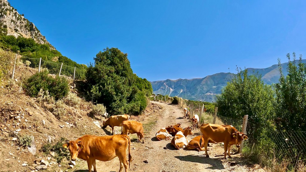 Die Küstenstrasse Richtung Norden bietet zahlreiche hübsche Ausblicke auf die Adria bis es bei Borsh rechts weg geht, zuerst auf einer staubigen Piste ins Tal rein und dann links über eine Brücke und in mehreren Kehren steil hoch. Kaum hat man bei einem Bauernhof das Gefühl die Anhöhe erreicht zu haben folgen je eine sehr steile Ab- und Auffahrt bevor man Çorraj erreicht, ein kleines Bergdorf, das nur über diese teilweise sehr groben Pisten erreichbar ist.