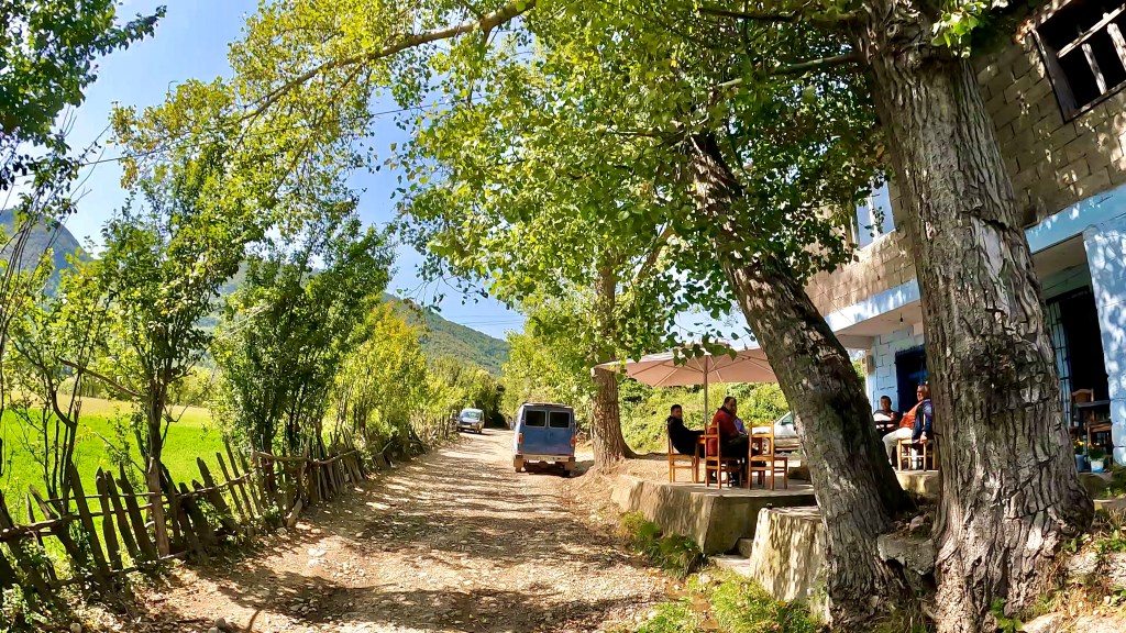 Ab Kuç folgt dann eine neue kleine Passstrasse (man kann sich vorstellen wie hier früher einfach durch das Flussbett gefahren wurde) bis zu einer Kreuzung mit einem einsamen aber sehr netten Restaurant inklusive hübscher Terrasse und Garten. Für Google geht es dann nur über Tepelenë weiter, ich hatte aber auf Satellitenbildern eine Strasse direkt nach Salari ausgemacht, die war dann sogar asphaltiert und bot immer wieder atemberaubende Ausblicke auf die Bergwelt und Schluchten dazwischen, auch auf die nun folgende Strecke Richtung Sinanaj.
