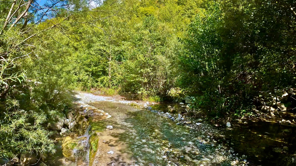 Seit einem Dutzend Kilometer befand ich mich wieder auf dem TET, dieser führte auf einer befestigten Strasse um einen Stausee bis Bukmirë und ab dort unbefestigt über einen Rücken und dann Mitten durch ein Gebiet wo die Überreste eines Buschbrandes augenfällig waren hinunter zu einem von mehreren Zuflüssen des Stausees, sehr hübsch und abwechslungsreich dieser Abschnitt.